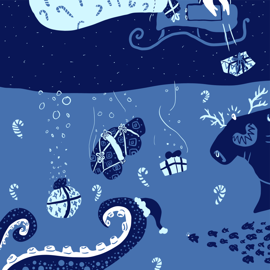 When the gifts are delivered the next day, Gilly loads them into a sack, borrows a red tracksuit** from Bradley Bigshot, and commandeers a submarine from the harbor. The player is tasked with using the submarine’s airlock to drop presents into the nesting grounds of his offspring. The player pilots the submarine along the seafloor and can release presents as he passes over a nest. The player scores points for each present that successfully lands in a nest, and a smaller amount of points for landing outside the nest within a certain range.